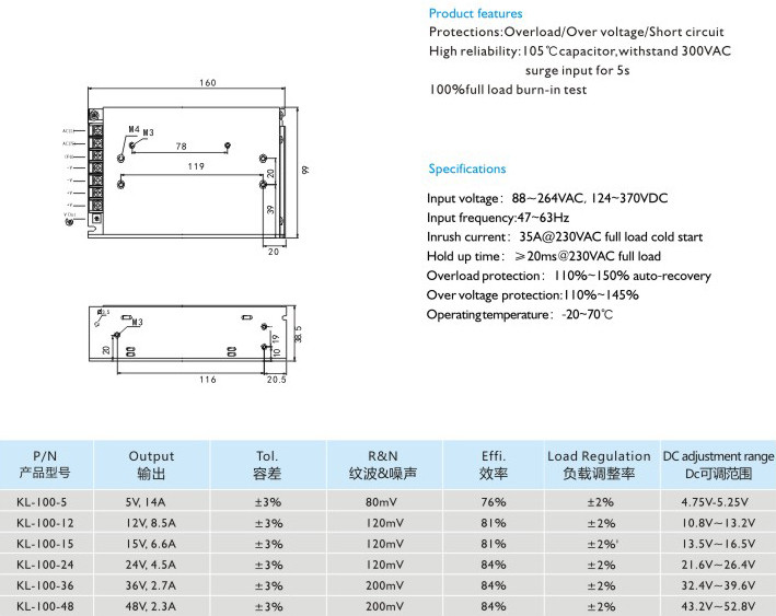 高可靠性:105C長壽命電容,能承受300VAC輸入電壓5秒不損壞